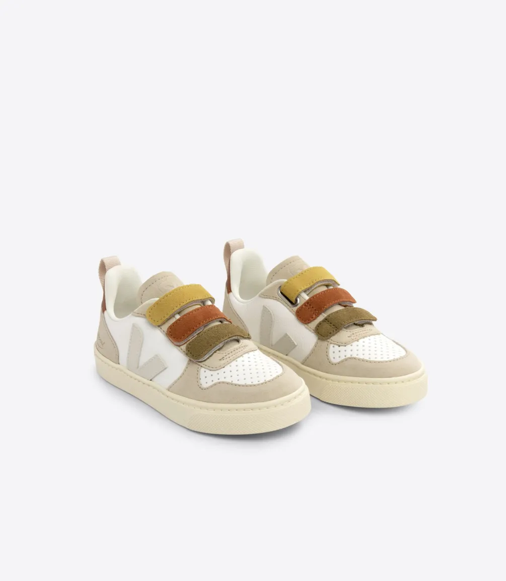 VEJA und Bonpoint arbeiten zum zweiten Mal zusammen, um zwei V-10-Modelle aus ChromeFree-Leder und Wildleder zu entwerfen, und ein neues Babymodell mit Fleecefutter, ideal für Neugeborene.