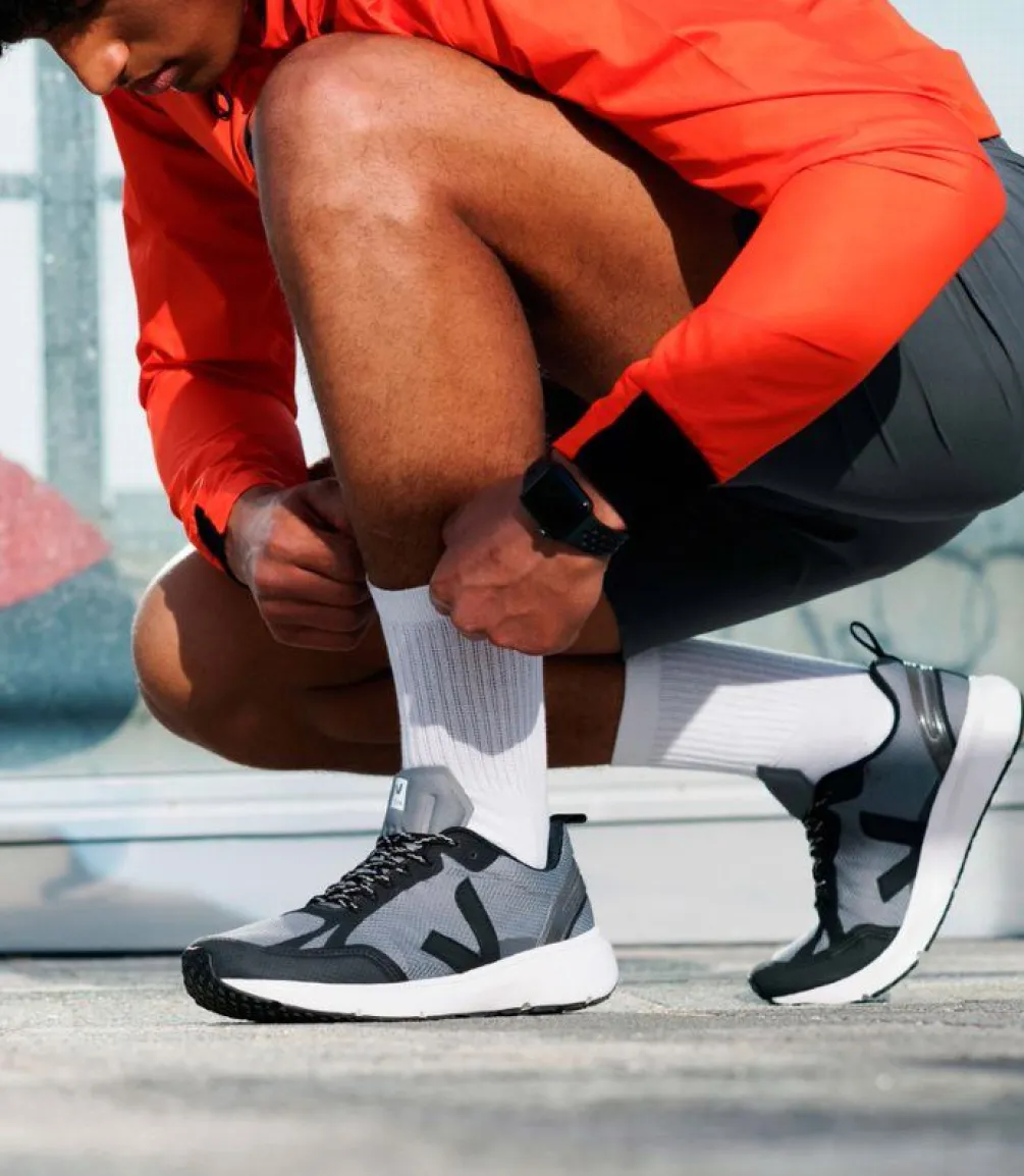 Das Alveomesh ist ein technisches Gewebe, das ausschließlich aus recyceltem Polyester besteht. Es bringt Atmungsaktivität, Flexibilität und Leichtigkeit in den Schuh.